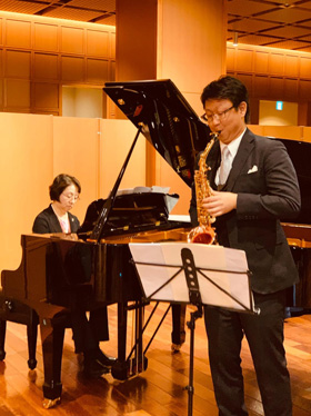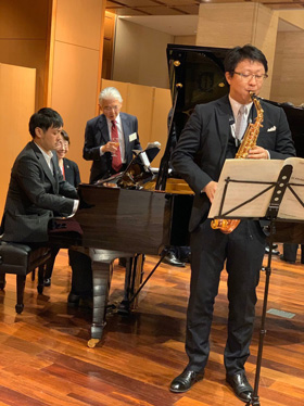 2019年12月6日、東京大学での忘年会パーティにてコンサートを依頼され、ミニコンサートを行いました。鳥居大輔氏、小野寺陸氏の2名をお迎えし、吹き抜けの素晴らしい会場、ヤマハS4のグランドピアノにて、ピアノ演奏もサックス演奏も大好評でございました。